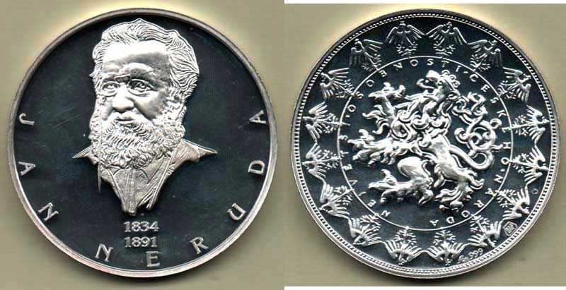 Největší osobnosti českého národa - Jan Neruda b.l. - poprsí čelně, vročení, opis / český lev, opis, kruh orlic, Sign., Ag999, 40mm, 29.013g