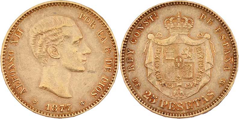 25 Peseta 1877/1877 DE-M, KM.673, Cayon.17525, 8.029g, dr.hr., vlas.škr., nep.rysky, pěkná patina