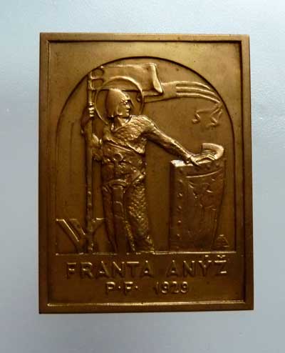 Šaloun L.- PF 1929 - sv.Václav se štítem a praporcem, nápis, Sign.LŠ, jednostranný patinov. bronz 45x59 mm, Kr.9