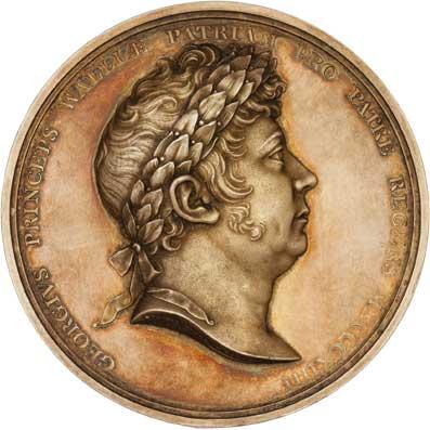 Korunní princ George - na mír ve Versailles 1814 - hlava zprava, opis / Niké a Británie chrání Evropu, opis, Sign.Barber-Wyon, zlac.Ag 69mm, 125.748g, dr.hr
