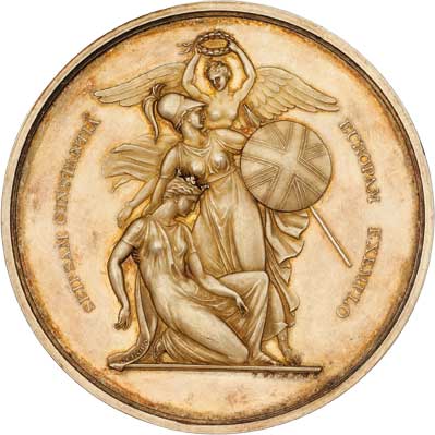 Korunní princ George - na mír ve Versailles 1814 - hlava zprava, opis / Niké a Británie chrání Evropu, opis, Sign.Barber-Wyon, zlac.Ag 69mm, 125.748g, dr.hr