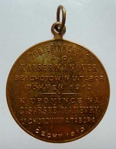 Chotoviny a Tábor 1913 (dělící čárka 2x5 mm) - dvojportrét císaře a následníka zleva, opis / nápis, M-B.86, zlac.bronz 29 mm s pův. raženým ouškem, pat.