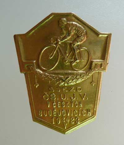 České Budějovice 1923 - Sjezd Čs.U.J.V. (Českosloven. ústřední jednoty velocipedistů), Nesign., mosaz 28x36 mm se zavíracím špendlíkem