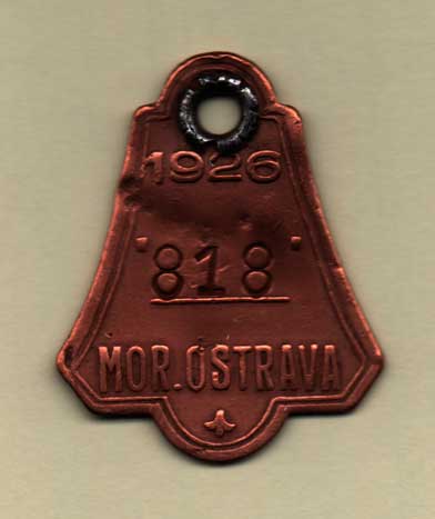 Moravská Ostrava 1926 - číslo 818 - měď 28x34 mm s původním otvorem pro zavěšení