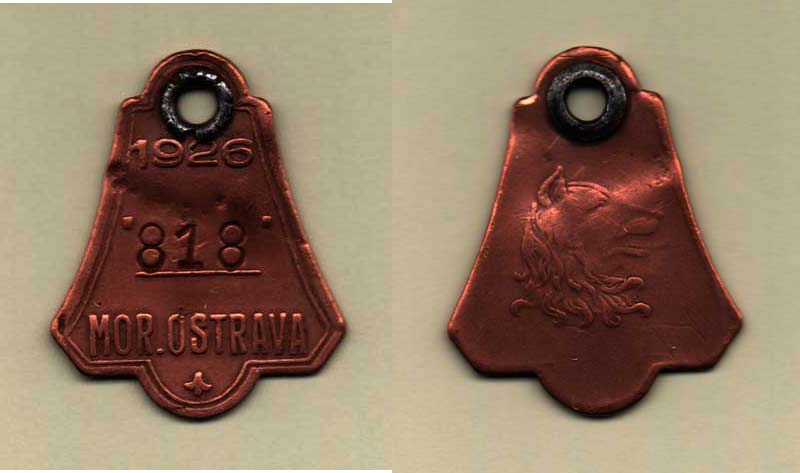 Moravská Ostrava 1926 - číslo 818 - měď 28x34 mm s původním otvorem pro zavěšení