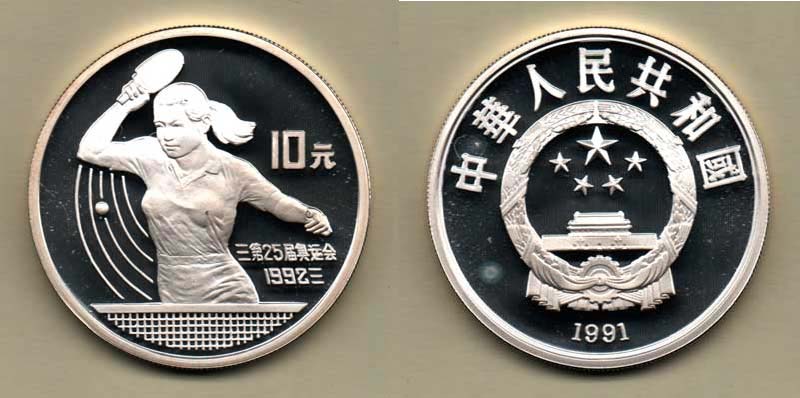 10 Yuan 1991 - LOH Barcelona 1992 - stolní tenis, Y.456 (pouze 30.000 ks), skvr., kapsle