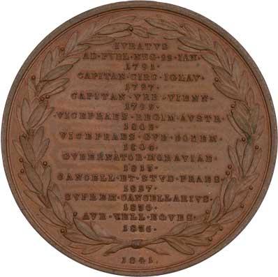 AE životopisná medaile (1815 morav. gubernátor) 1841 - hlava zleva, opis / 19-řádk. latin. nápis ve věnci, Sign.I.Schön, 50mm, BPM.283, Don.3607, patina, téměř