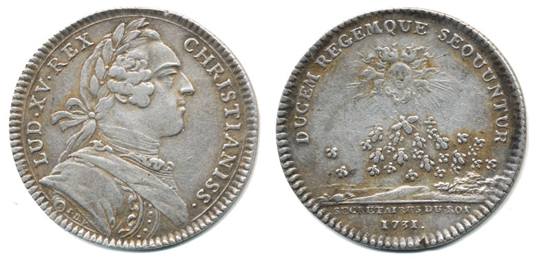 Ludvík XV. (1715 - 1774), 1731 Portrét zprava, opis / slunce a roj včel nad krajinou opis a nápis, Nesign., Nepunc., Ag 30 mm, 7,6 g_n.hr.