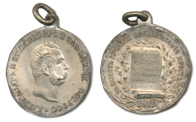 Mikuláš II. - medaile na 50 let zrušení nevolnictví 1861 - 1911 Portrét cara Alexandra II. zprava, opis / listina s písmem, opis Sign.M.H., Postř.bronz 26 mm_orig.raž.ouško tém.
