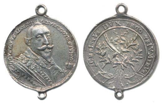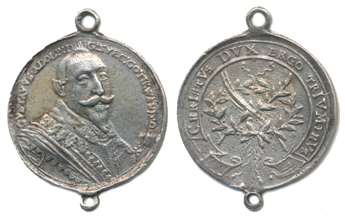 Gustav II. Adolf, úmrtní medaile z roku 1632 (let.chronogramem) Poprsí krále mírně zprava, opis / ratolesti, lat.opis Christvs Dvx Ergo Trivmphvs, Nesign., lité Ag 27 mm, 5,66 g_2 ouška k uchycení R!