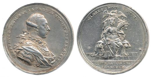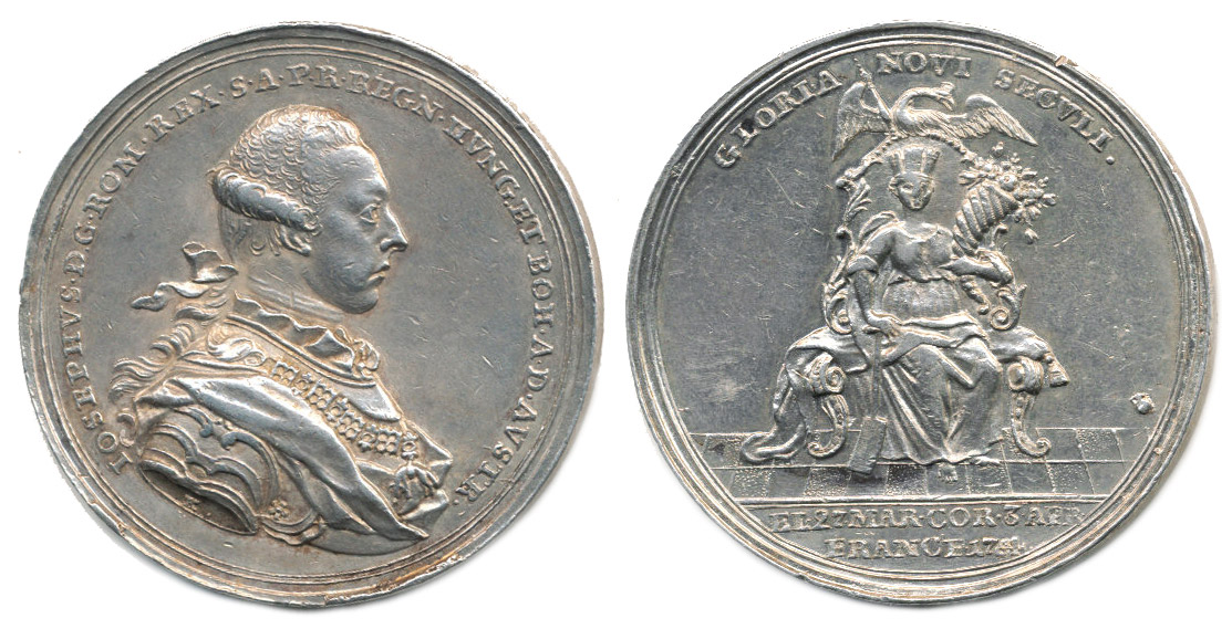 Krafft - ke korunovaci na římského krále ve Frankfurtu n.M. 3.4.1764 Poprsí císaře zprava, opis / sedící alegorická postava s římskou korunou na hlavě, 2řádk.nápis v úeči, opis, Sign.K., Ag 45 mm, 28,51 g Nov.XV/C-7a, Ho.3123, JF.848_dr.hry R!