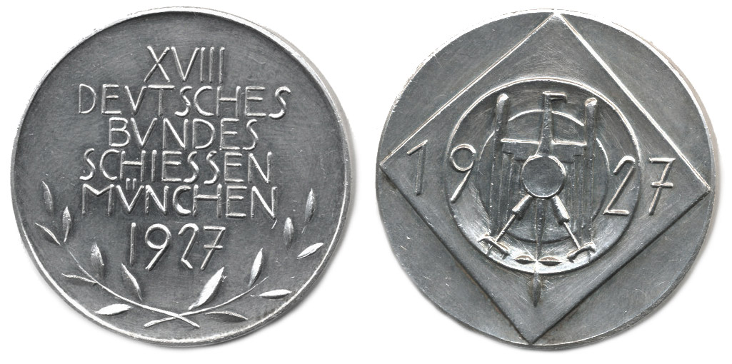 Německo - Mnichov XVIII. německé spolkové střelby 1927 6řádk.nápis na větvičce / stylizovaná německá orlice, vročení Punc.na hr. 950, Ag 40 mm, 30,84 g_tém.
