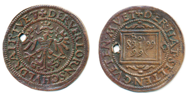 Početní peníz b.l., Tyroly - Hall, orlice, opis / tabulka, opis Cu 23 mm, Prokisch.A.1/3/12, Tur.1988/71/35_dírka