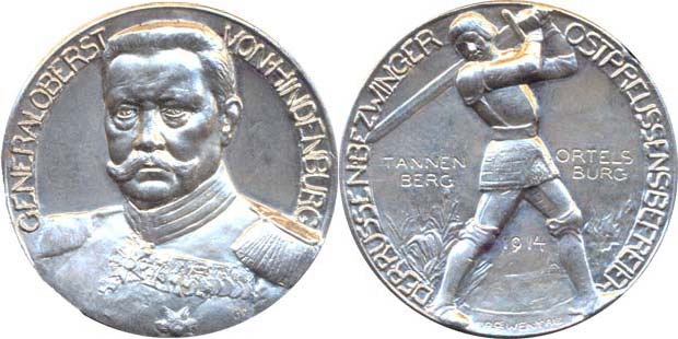 Generál plukovník von Hindenburg - Tannenberg Ortelsburg 1914 Poprsí mírně zleva, opis / stojící rytíř s mečem zprava, opis Sign.A.Löwental/Ball/Berlin, Punc.990, Ag 33 mm, 17.85 g, Zetz.4025_R!