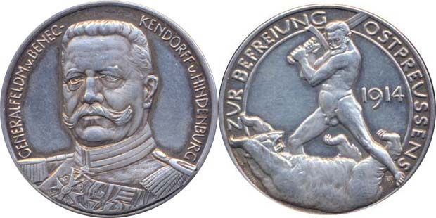 Generál a polní maršál von Hindenburg - na osvobození východního Pruska 1914, poprsí čelně mírně zleva, opis / stojící rytíř s mečem zleva, opis, Sign.A.Hummel(LAuer/Nürnberg, Punc.990, Ag 33 mm, 17.95 g, Zetz.4030