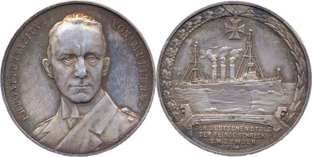 Fregatní kapitán von Müller - německá pýcha 1914 Poprsí čelně, opis / německý parník, 4řádk.nápis Sign.Lauer/Nürnberg, Punc.990, Ag 33 mm, 17.95 g, Zetz.4051
