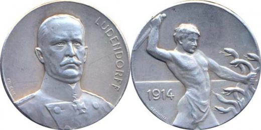 Ludendorff - medaile 1914 Poprsí čelně, opis / Herakles bojuje s Hydrou, vročení Sign.E.Eue/Grünthal/Berlin, Punc.800, Ag 34.5 mm, 17.6 g, Zetz.4063_R!