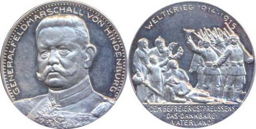 Generál polní maršál von Hindenburg - osvoboditel vých.Pruska 1915 Poprsí mírně zleva, opis / lid poučící se s vojáky, opis Sign.Oertel/Berlin, Punc.990, Ag 35.5 mm, 18.5 g, Zetz.4082_R!