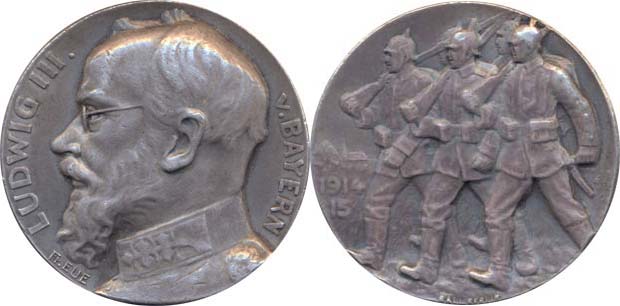Ludwig III. v.Bayern - medaile -1914 - 1915 Portrét zleva, opis / 3 kráčející vojáci zleva Sign.E.Eue/Ball/Berlin, Punc.800, Ag 34 mm, 17.6 g, Zetz.2147_R!