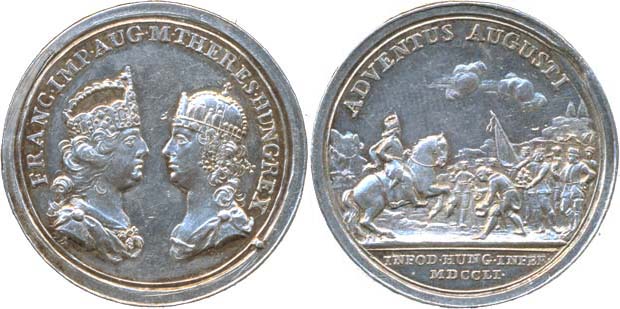 M.Donner - medaile na návštěvu dolnouherských horních měst, 1751 Portréty proti sobě, opis / císař na koni zdravený 9 horníky, 2řádk. nápis v úseči, opis, Sign.D, Ag 29 mm, 7.68 g, Mo.1827, We.7769, _R! tém.