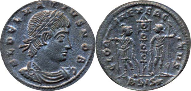 AE3/4, Rv:"GLORIA.EXERCITVS.", dva vojáci se standartou minc.Siscia, S.3831var., C.4, RIC.69_R!