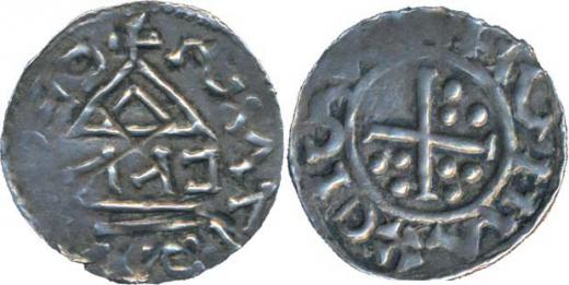 Denár, kříž se třemi kuličkami ve třech polích, zkorumpov.opis / nápis pod kaplicí, zkorumpov.opis, jako C.13-16_R!