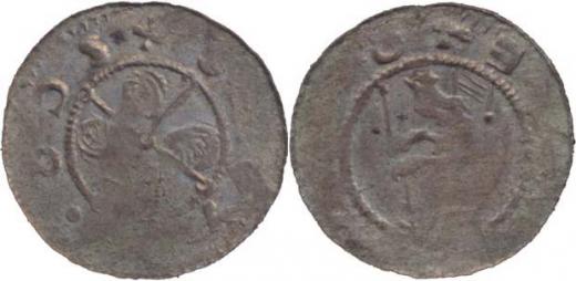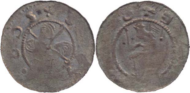 Denár, 4 hlavičky z profilu / sedící postava zleva drží kříž jako Šm.490, jako Ca.514_ned. starý podložní štítek V.Klímy RR!