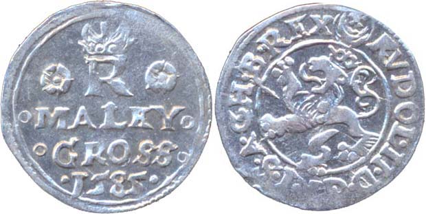 Malý groš 1585, Jáchymov-Hoffmann, HN.8a (opis 7c), varianta nápisu: "o MALEY o/o GROSS o/. 1585 ."_č.ned.