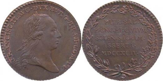 Větší peníz na holdování v Belgii (Brusel), 1794 Portrét zprava, opis / 5řádk.nápis ve věnci Bronz 28 mm, Nov.XVII/M-4b_R!