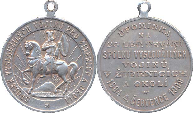 Židenice - upomínka na 25 let trvání spolku vysloužilých vojínů 4.července 1884 - 1909, sv.Václav na koni zleva, opis / 8řádk.nápis Nesign., Postř.bronz 29 mm_orig.raž.ouško