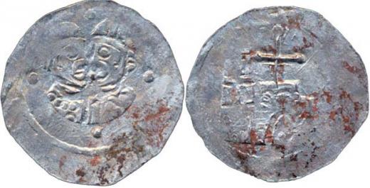 Denár nepřidělený (30.léta 12.stol.), dvě stojící postavy proti sobě / kostel s věží a křížem, Šm.505, VP.238, PV.18, 0,40 g_dr.ned. RR!