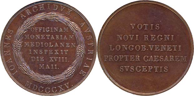 Nesign. - na návštěvu milánské mincovny XVIII.5.1815 5řádk.nápis / 6řádk.nápis ve věnci, opis, Bronz 38 mm, Mo.2419_R!