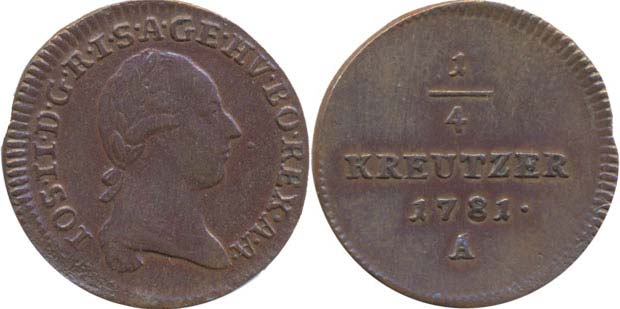 Cu 1/4 Krejcar 1781 A, P.48, AM.1_tém.