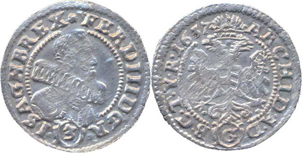 3 Krejcar 1637 G, G.A.Hübner, Nech.151, MKČ.1337, Her.827