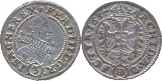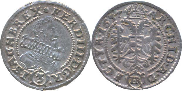 3 Krejcar 1637 HR, Hans Rössner, jako Nech.150, jako MKČ.1336, var.bez křížku mezi hlavami orla_R! tém.