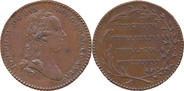 Menší peníz na holdování v Belgii, 1781 Portrét císaře zprava, opis / 4řádk.nápis ve věnci Bronz 22 mm, Nov.XV/H-8c, LG.XIV/934_R!