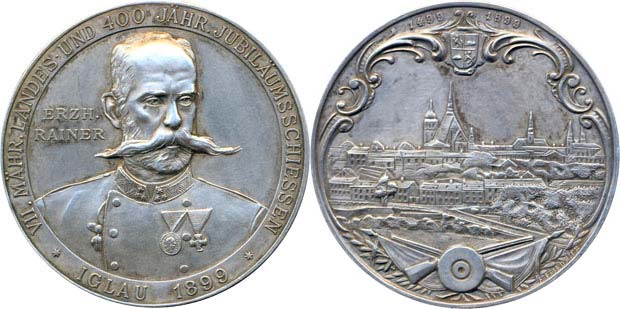 Jihlava (Iglau) - VII. moravské zemské střelby a 400 leté střelecké jubileum 1499 - 1899, portrét arc.Rainera čelně, opis / pohled na město, vročení, Sign.F.Friedrich, 2x Punc., Ag 37 mm, 25.44 g_tém.