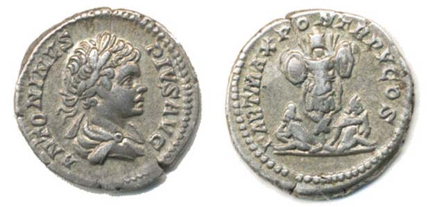 AR Denár, Rv:"PART.MAX.PONT.PR.P.V.COS.", trofej a dva sedící zajatci, jako S.1826, RIC.61, ražba z roku 202