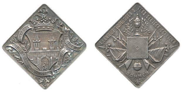Chomutov (Komotau) - na I.zemské střelby svazu něm.střelců 1894 Korun.znak, nápis na stuze, dubové lístky / terč, vlajky, pohár Nesign., 2x Punc., Ag klipa 23 g, 34x34 mm_R!