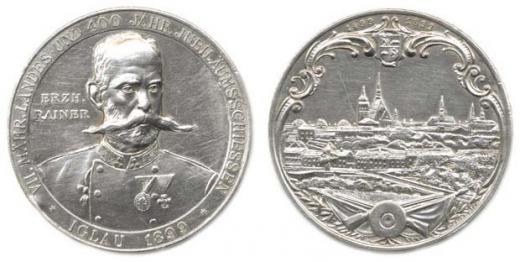 Jihlava (Iglau) - VII. moravské zemské střelby a 400 leté střelecké jubileum 1499 - 1899, portrét arc.Rainera čelně, opis / pohled na město, vročení, Sign.F.Friedrich, 2x Punc., Ag 37 mm, 25.45 g_tém.