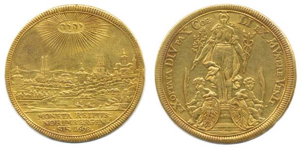 6 Dukát (Au odražek tolaru) 1698 - na mír v Rijswijcku Pohled na město, 3řádk.nápis v úseči / stojící Bohyně míru se dvěma znaky, opis, letopočet chronogramem, KM.1872 (1747) LG.III/522 (Ag), 20.61 g_RR! tém., LG.III/522 (Ag), 20.61 g_RR! tém.
