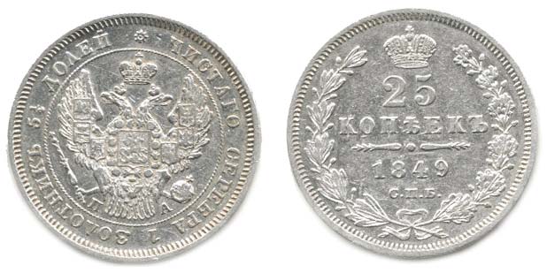 25 Kopějka 1849 SPB-PA, Sankt Petěrburg, Cr.166.1, Uzd.1671, Bitkin.2300_tém.