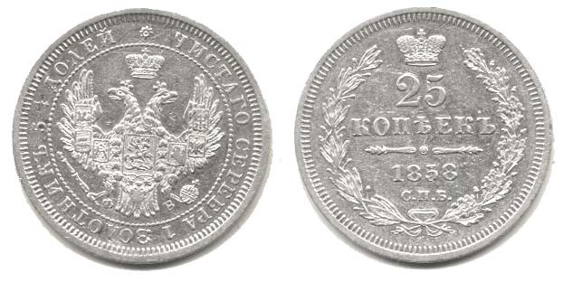 25 Kopějek 1858 SPB-FB, Y.16.1, Cr.166.1, Uzd.1706 skup.XVIII-B/b_tém.