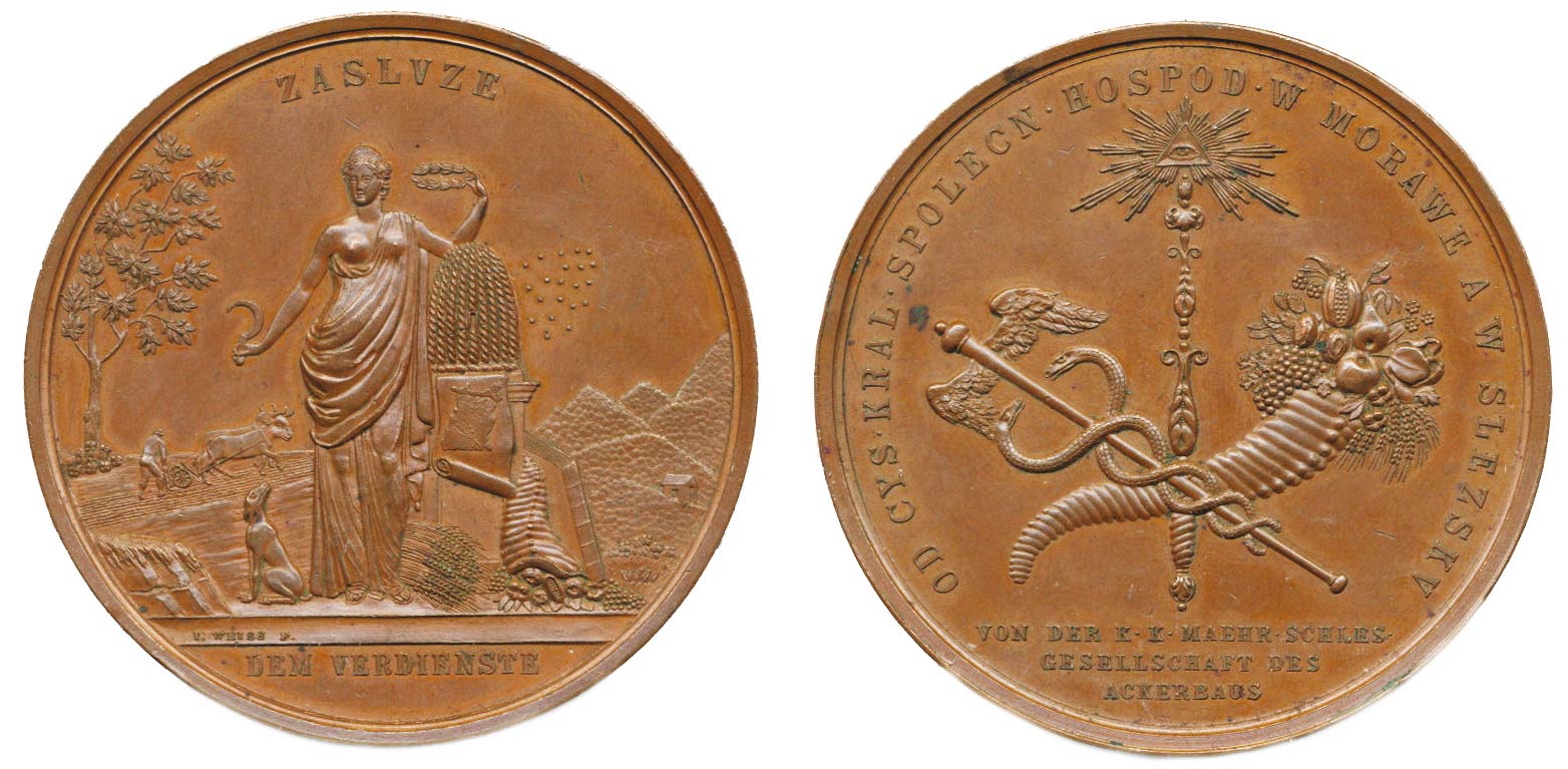 Hospodářská společnost pro Moravu a Slezsko, b.l.#Br Stojící Ceres se symboly úrody, nápis / symboly moci a bohatství, písmo, Sign., Bronz 62 mm, MZČ.119/2, Ho.6095