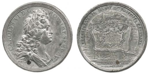 G.W.Vestner - medaile na dobytí pevnosti Temešváru 1716 Poprsí císaře zprava, opis / půdorys pevnosti, 2řádfk.nápis v úseči, opis, Sign., Sn 44 mm, 26.31 g, We.-, Mo.-, Ho.-, LG.XV/654_RR!