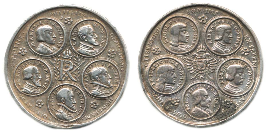 Medaile na 10 císařů Habsburského rodu, 1594 Habsburský znak, kolem 5 císařů, květiny / korunov."R", kolem 5 císařů, Nesign. (V.Maler), Ag 39 mm, 17.8 g, LG.II/190_R!