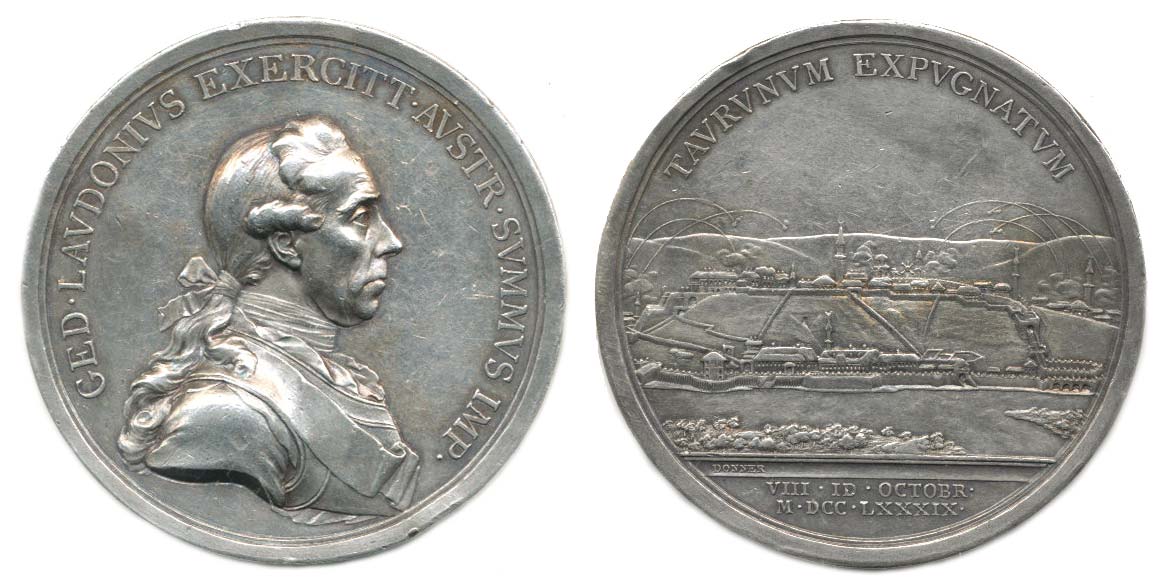 Donner - medaile na dobytí Bělehradu, 8.X.1789#Ag Poprsí zprava, opis / město s minarety v dělostřelecké palbě, 2řádk.nápis, opis, Sign., Ag 47 mm, 34.94 g, Ho.7433_tém.