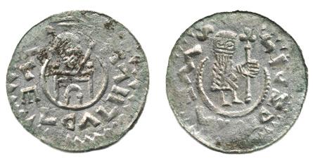 Denár nepřidělený, stojící postava zprava s křížem / hlava nad stolcem zprava, před ní praporec, Šm476, VP.77, C.511_dr.ned. při okr. RR!