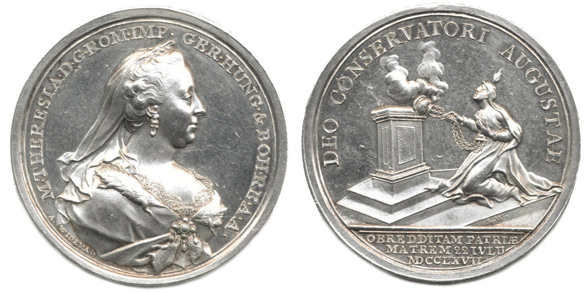 Wiedeman - na uzdravení od něštovic 1767 Poprsí zprava, opis / klečící královna před oltářem, opis a nápis v úseči, Sign., Ag 47 mm, 34.73 g, Mo.1976, Ho.2947, LG.XIV/222