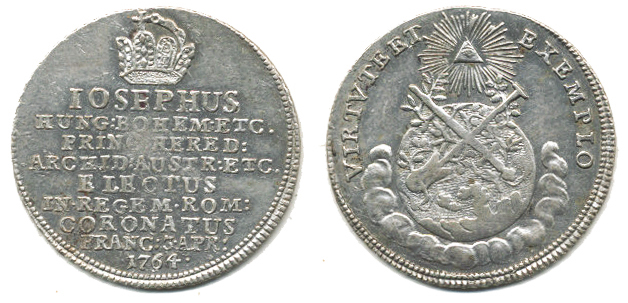Větší peníz na korunovaci ve Frankfurtu, 3.IV.1764#Ag Pluh a meč na zeměkouli, boží oko, opis / cís.koruna a 9řádkový nápis, Ag 25 mm, 4.10 g, Nov.XV/C-13b, Neum.36332